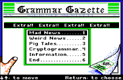 Grammar Gazette is a product from MECC’s Grammar Series. Two other products in the series, Grammar Toy Shop (targeted for grades one and two) and Grammar Monsters (designed for grades three and four), also give students practice with grammar skills.